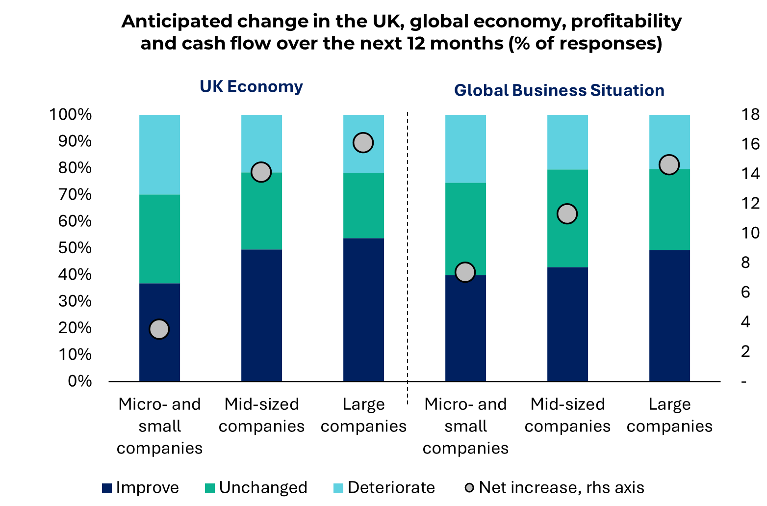 Ancak bu iyimserlik homojen değil. Mikro ve küçük işletmeler daha temkinli; %66’sı Birleşik Krallık ekonomisinin 2026’da ya daha kötüye gideceğini ya da değişmeden kalacağını düşünüyor. Buna ek olarak, faiz oranı oynaklığı, siber tehditler ve tedarik zinciri kesintileri gibi yapısal riskler birçok sektörde sürüyor.
