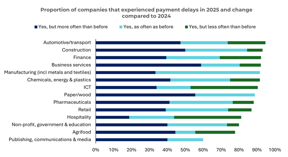En uzun ortalama gecikmeler inşaat (38,2 gün) ve iş hizmetleri (38,1 gün) sektörlerinde raporlandı. En kısa gecikmeler ise yayıncılık-iletişim-medya alanında (21 gün). Ancak, ortalama gecikmesi en kısa olan bu sektörde bile şirketlerin yaklaşık %50’si geç ödemelerin nakit akışlarını ciddi şekilde etkilediğini belirtti.