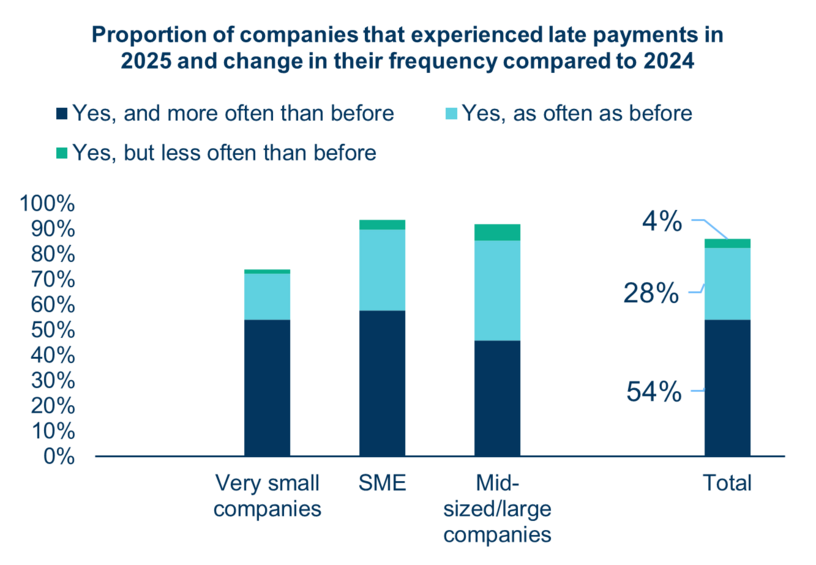 Fransız şirketlerinin %86’sı, son 12 ay içinde ödeme gecikmeleri yaşadığını bildiriyor (2023’te %82, 2024’te %85). Sorun tüm sektörlerde yaygın; mikro işletmelerin yarısından fazlası bu gecikmelerin etkisini “kritik” olarak tanımlıyor.